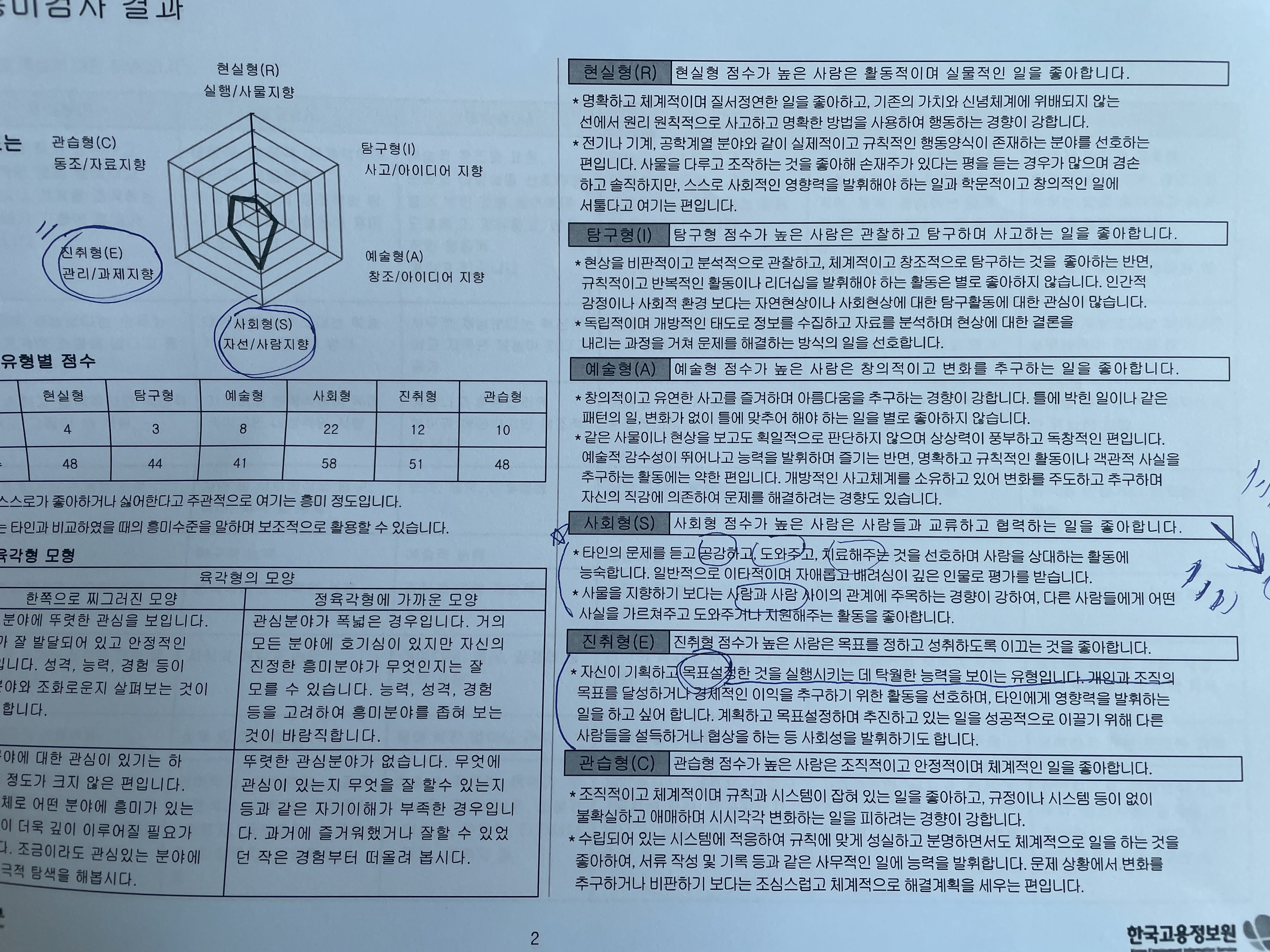 두 번째 방문 전 과제로는 워크넷에 직업심리검사 l유형 검사를 해오라고 하셨고, 과제는 반드시 방문전에 하고 방문을 해야한다. 혹시 하지 않았다면 연기하거나 방문일자를 변경해야 한다고 하셨다. 검사는 꽤 많은 항목을 다루고 있어서 시간이 많이 걸렸다. 두번째 방문에서도 역시 직업심리검사에 대한 검사지를 출력 받고 설명을 들었다. 나에 대해서 알 수 있어서 유익한 시간이었다.